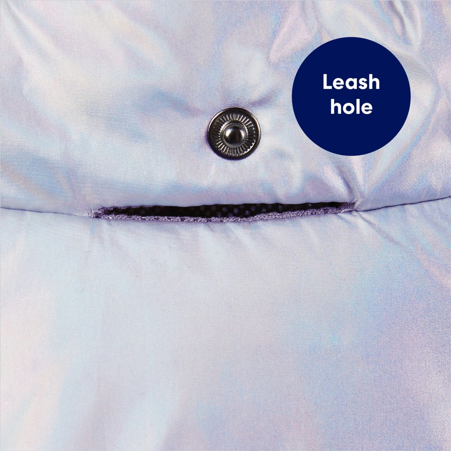 - This premium quilted puffer combines several snug features with a shimmery, iridescent-silver undertone shell that’ll make your pet shine.