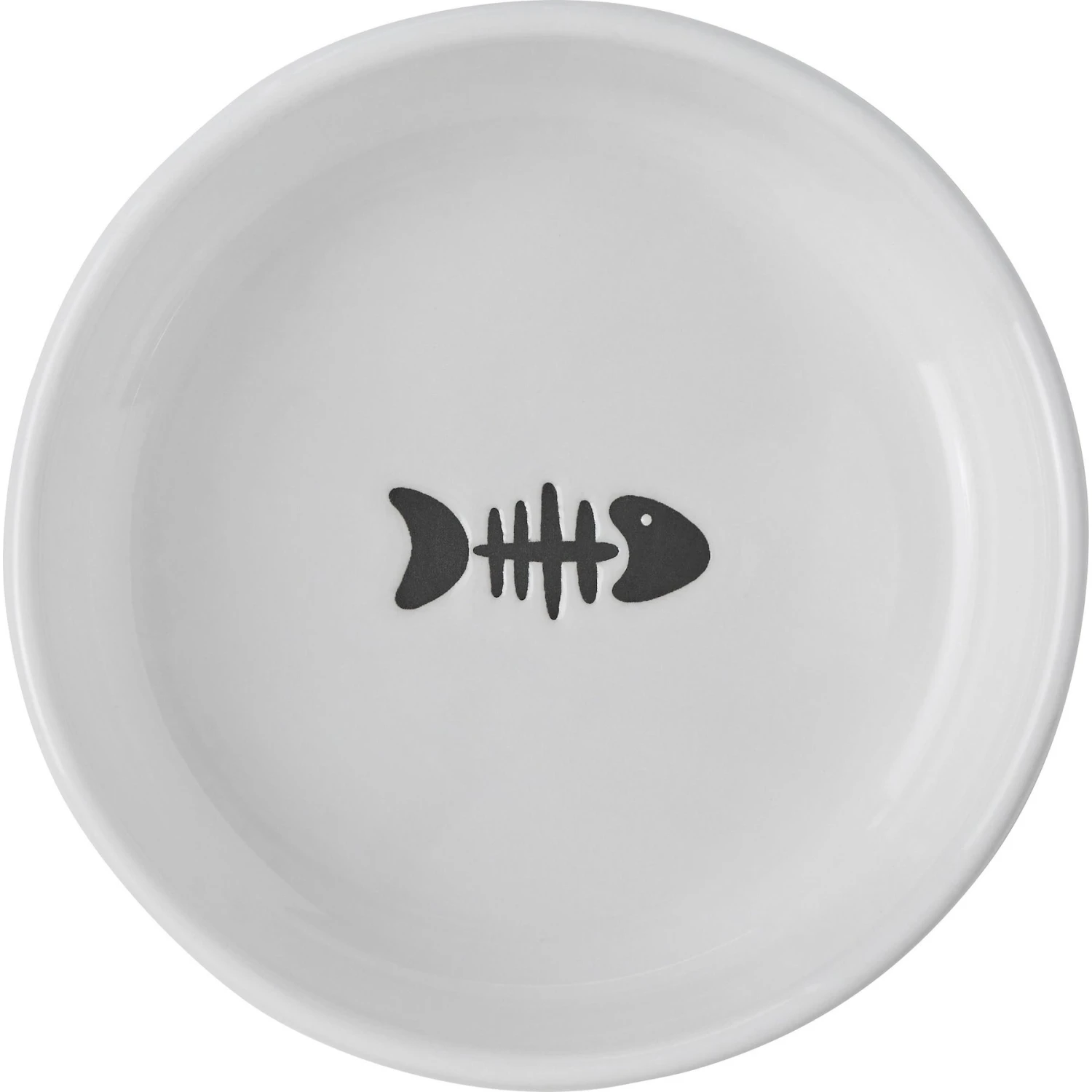 - Round, white ceramic pet bowl with a cute “meow” graphic on the side.